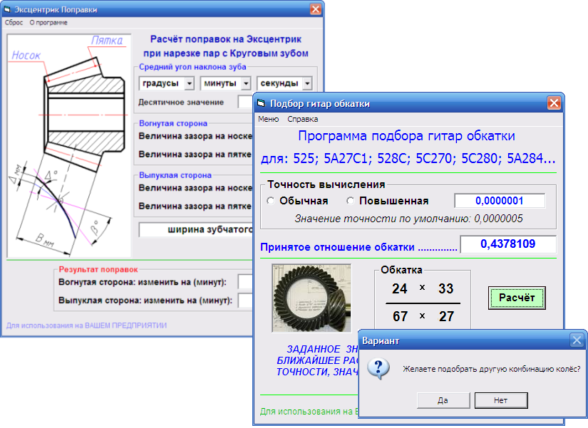 Расчёт Карт наладок под нарезку Кругового зуба. Расчёт и Высокоточный подбор Шестерён гитар Дифференциалов зуборезных станков. Расчёт Геометрических параметров Гипоидных пар. Расчёт и Высокоточный подбор гитар Обкатки. Разработка прикладного программного обеспечения к станкам ЧПУ. Расчёт Кулаков к Пилозаточным станкам. Глобоидные пары. Расчёт Геометрических параметров Конических пар с Круговым зубом.